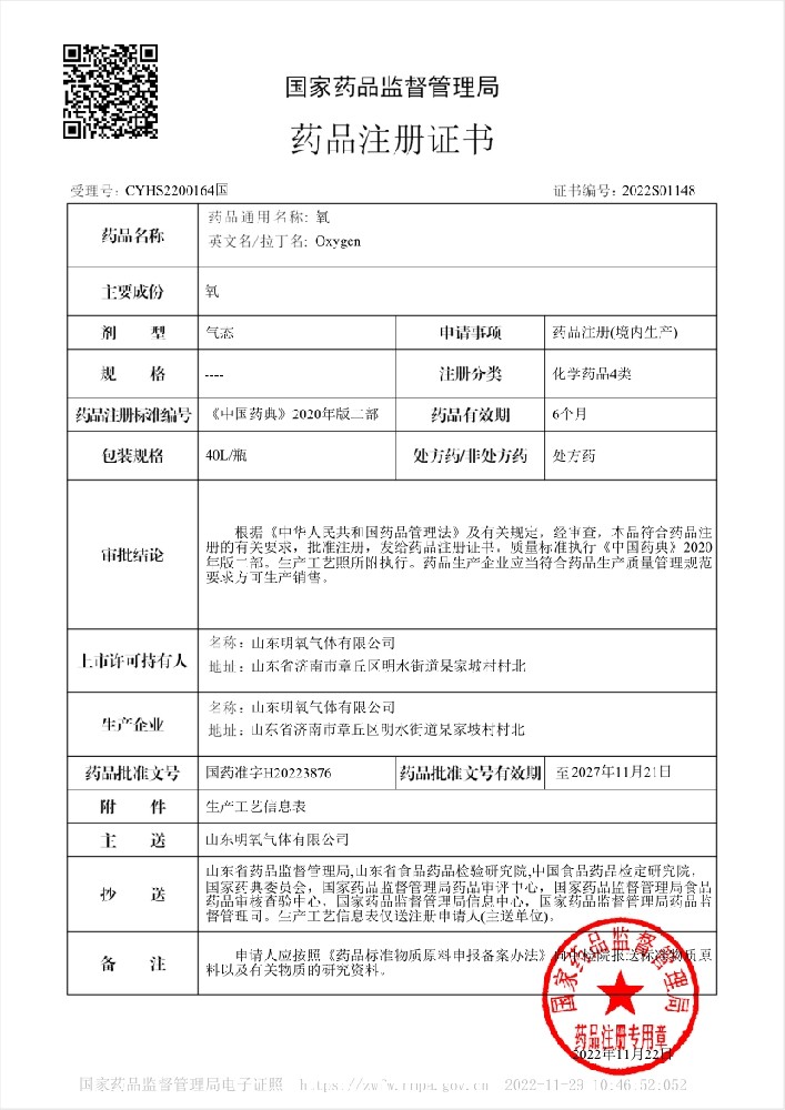 2022年12月取得國家藥品監(jiān)督管理局頒的藥品注冊證書,醫(yī)用氧項目正式投入生產